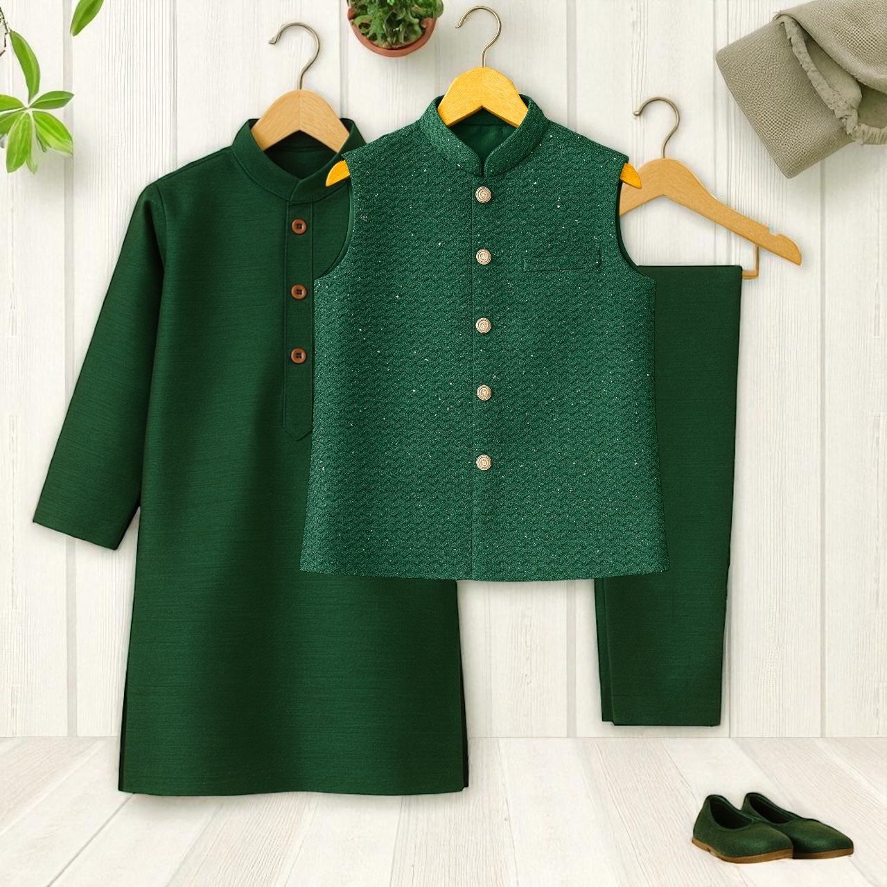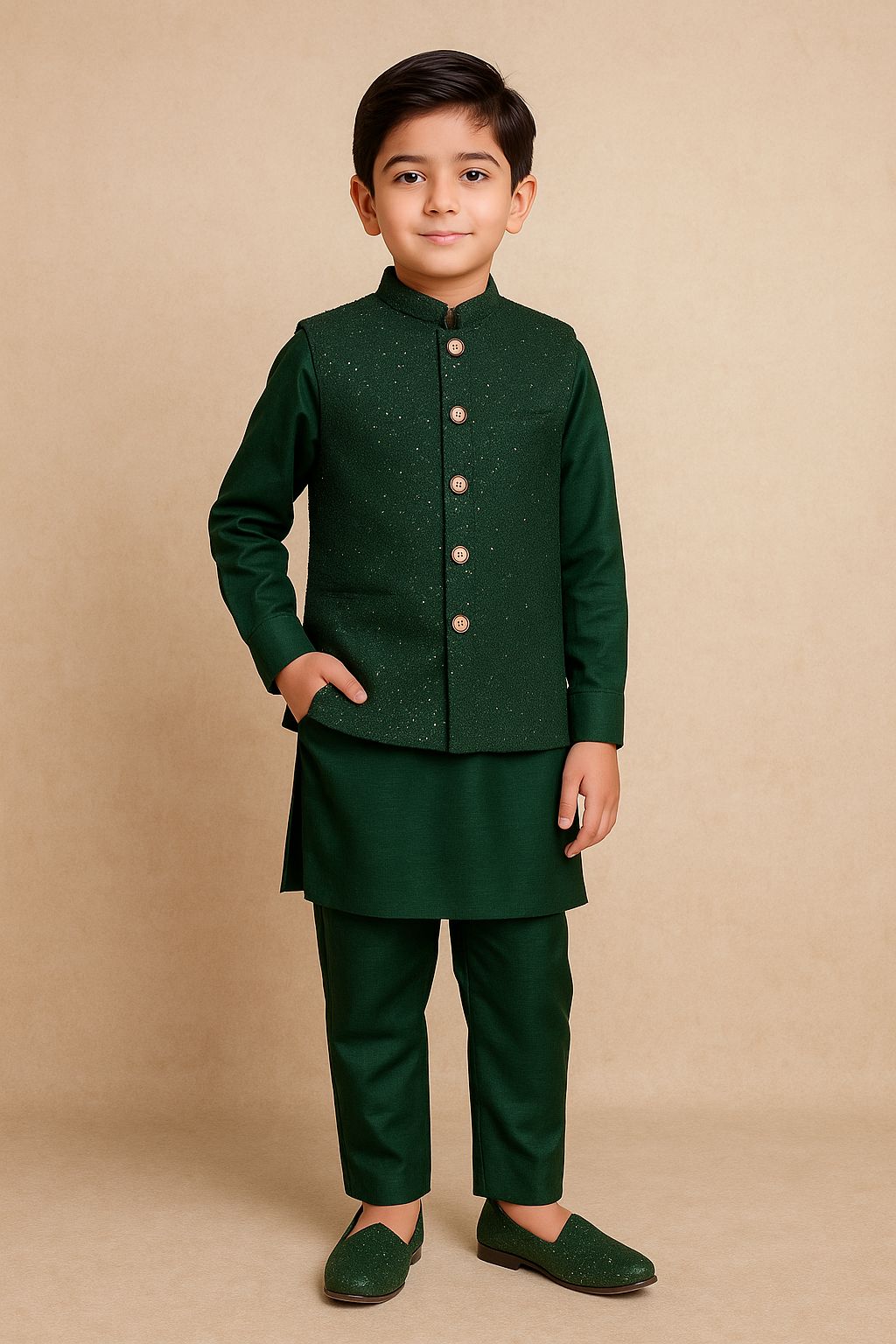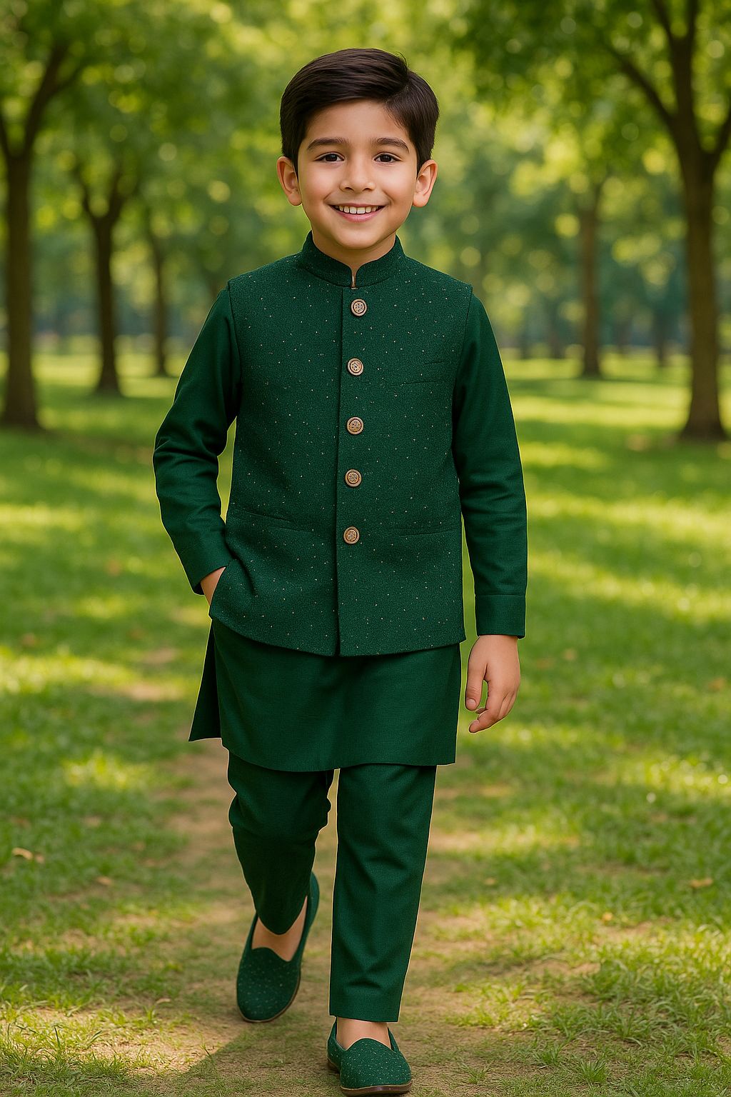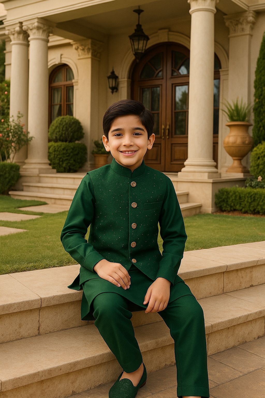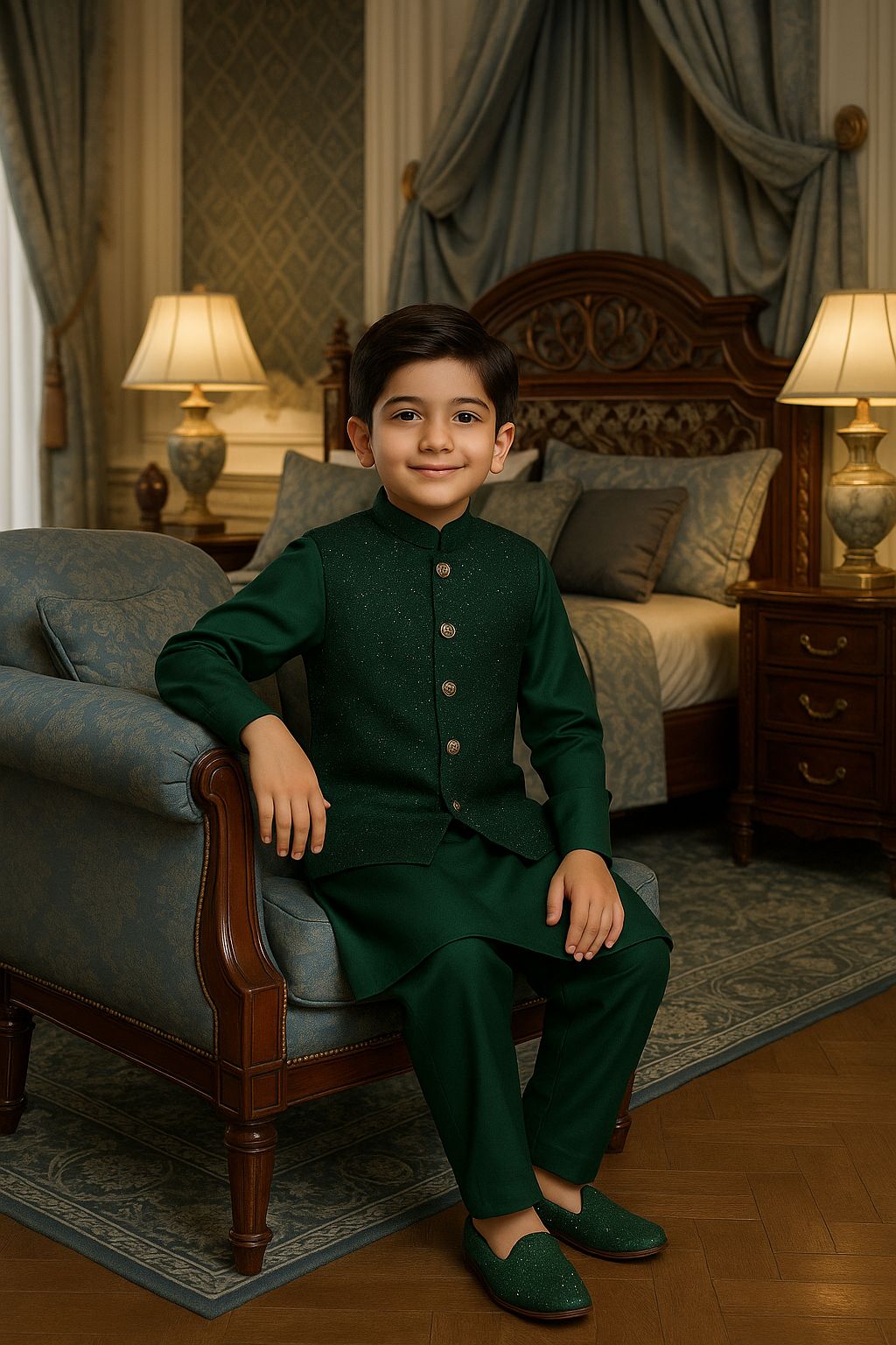 Crafted in premium silk, this elegant 3-piece suit features a high-quality embroidered waistcoat, stitched to perfection. Ideal for ages 2 to 14 years, it’s a regal choice for festive & formal occasions — style, comfort, and charm in one graceful look.
